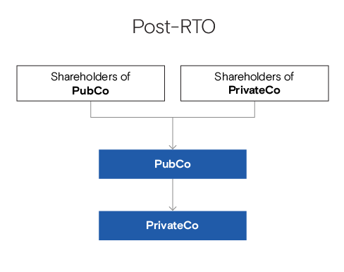 Therefore, the result of such transaction is for PrivateCo to indirectly go public. PubCo, while remaining listed on the relevant stock exchange, now holds the assets or operations of PrivateCo, but has undergone a change of control, as the shareholders of PrivateCo will generally hold a majority interest (a controlling stake of at least 20%) in PubCo following the closing of the RTO; changes to its composition of the Board of Directors will likely occur to reflect this change of control.