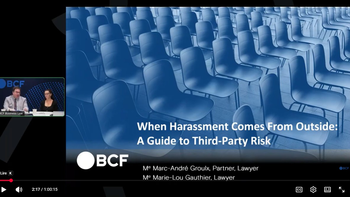 In the webinar “When Harassment Comes From Outside,” presented by Tim Harty, CEO of Mondaq, with Marc-André Groulx and Marie-Lou Gauthier, we analyze the obligations of employers in Québec, elsewhere in Canada and internationally. The evidence is clear: expectations of employers are rising everywhere.