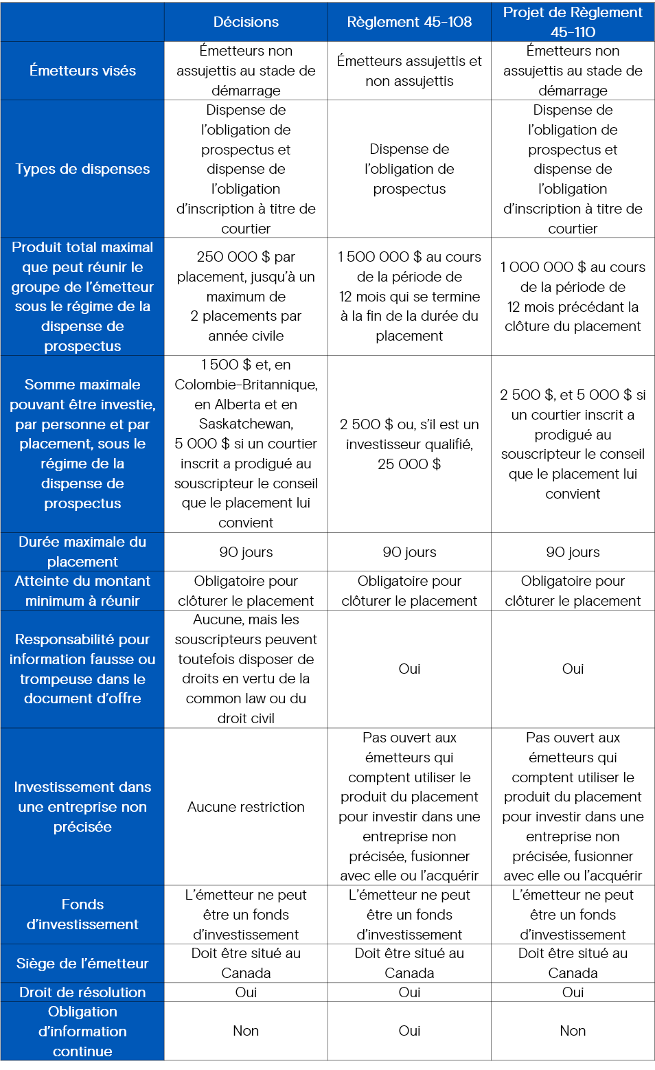 Afin de mieux cerner et différencier les principales caractéristiques des régimes mis en place en vertu des Décisions, du Règlement 45-108 et du Projet de Règlement 45-110, nous avons dressé le tableau comparatif ci-dessous :