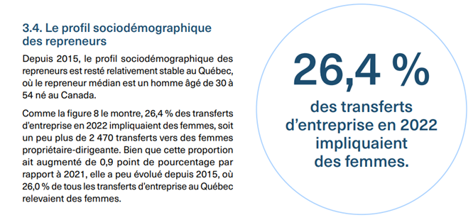 Dans ce contexte, une réalité interpelle : les femmes ne représentent qu’environ 26 % des repreneurs d’entreprises au Québec.